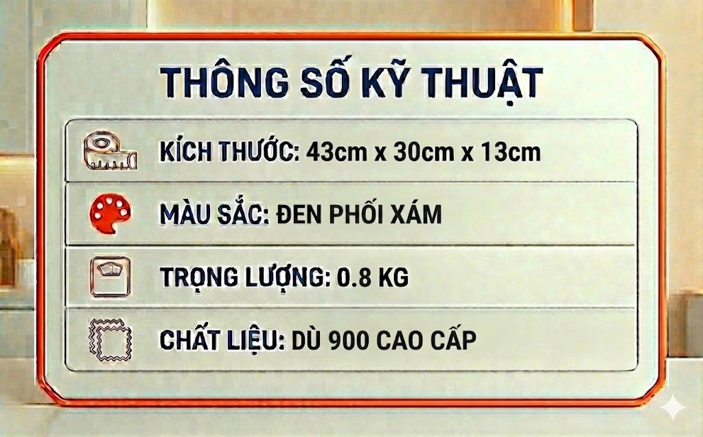 Sản phẩm có kích thước chuẩn 43 x 30 x 13cm, được thiết kế thành nhiều ngăn kết hợp các ngăn phụ nhỏ phía trước và hai bên hông rất tiện lợi. Balo có trang bị ngăn chống sốc đựng laptop riêng biệt, có thể chứa được laptop lên đến 15.6 inch.