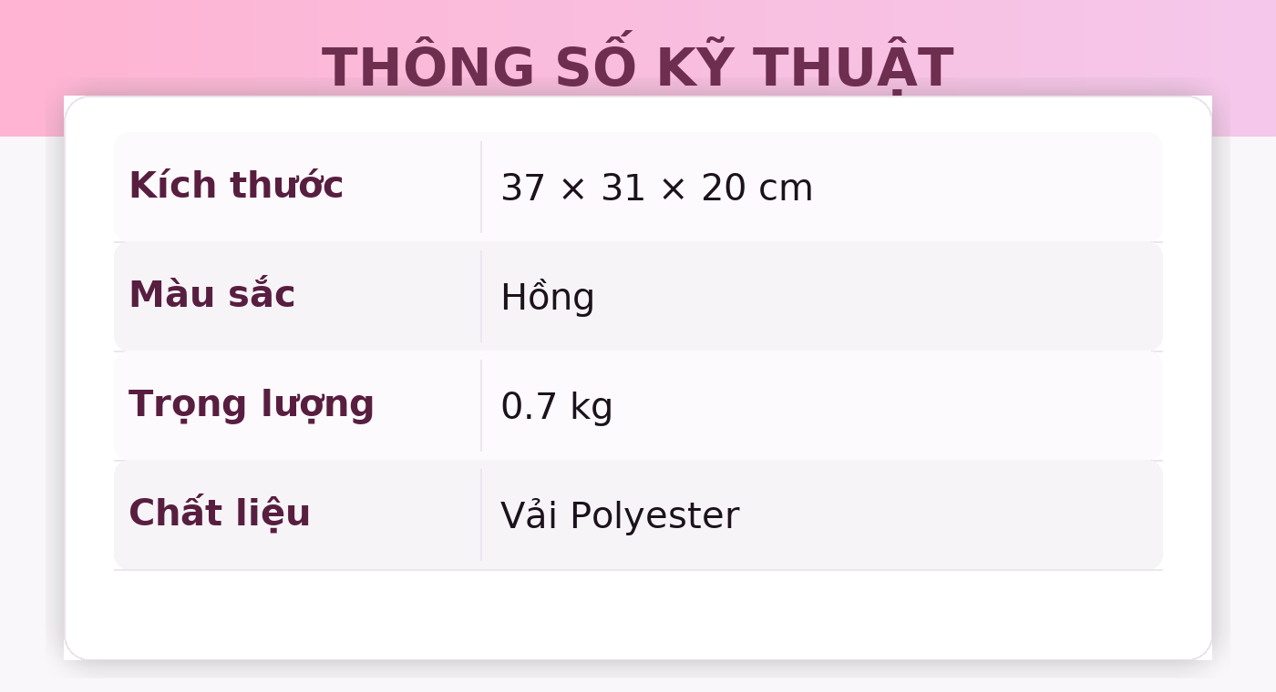Sản phẩm có kích thước 37 x 31 x 20cm, ngoài ngăn chính rộng lớn thì còn được trang bị thêm các ngăn phụ tiện lợi và túi lưới hai bên hông. Học sinh có thể sắp xếp, tổ chức đồ đạc, sách vở gọn gàng, ngăn nắp.