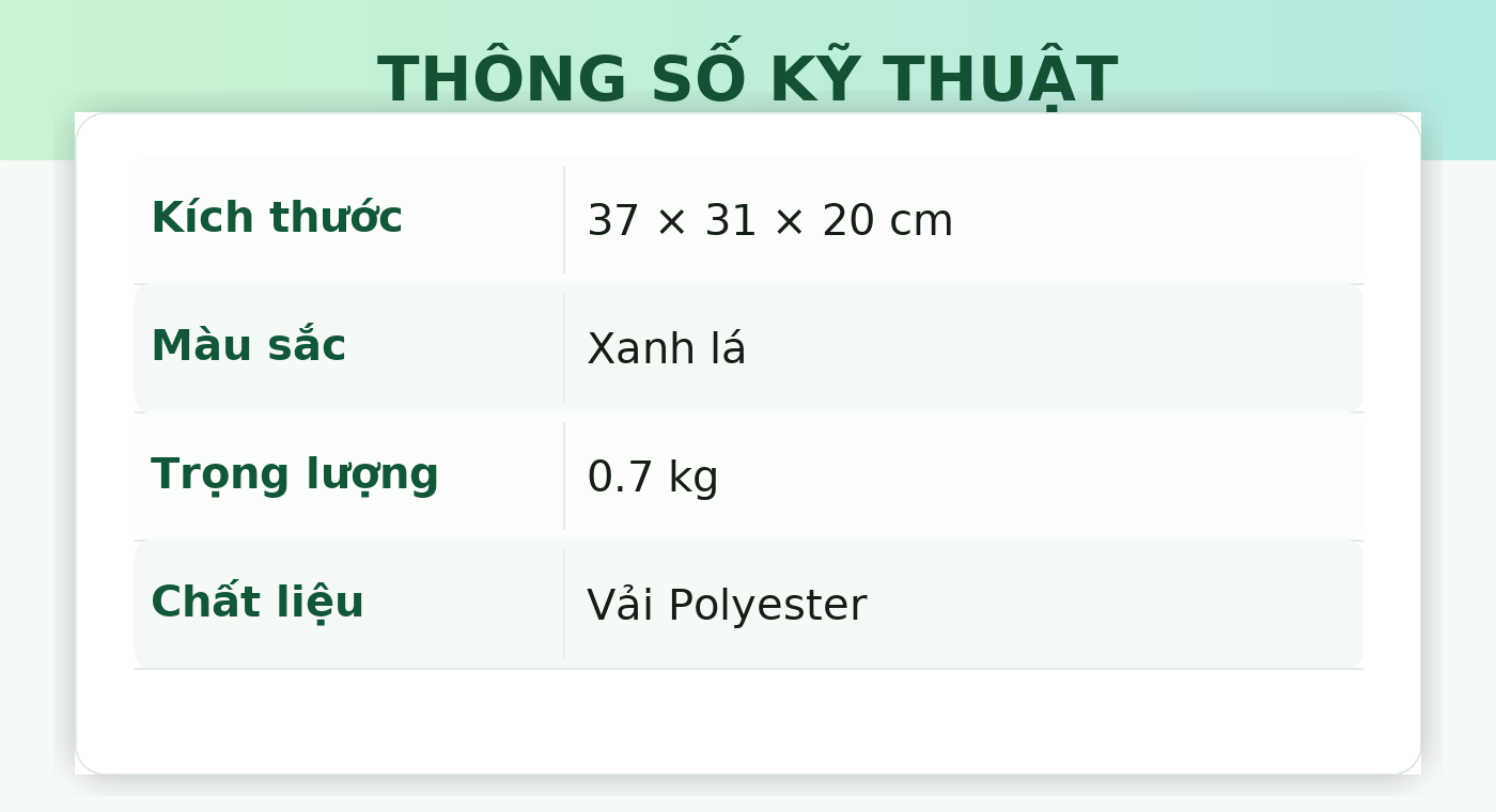 Sản phẩm có kích thước chuẩn 37 x 31 x 20cm, có nhiều ngăn chứa được bố trí một cách khoa học cho phép bé có thể đựng sách vở, dụng cụ học tập, hay đồ dùng cá nhân gọn gàng, ngăn nắp khi đi học, đi hội thao, tham gia hoạt động ngoài trời,...